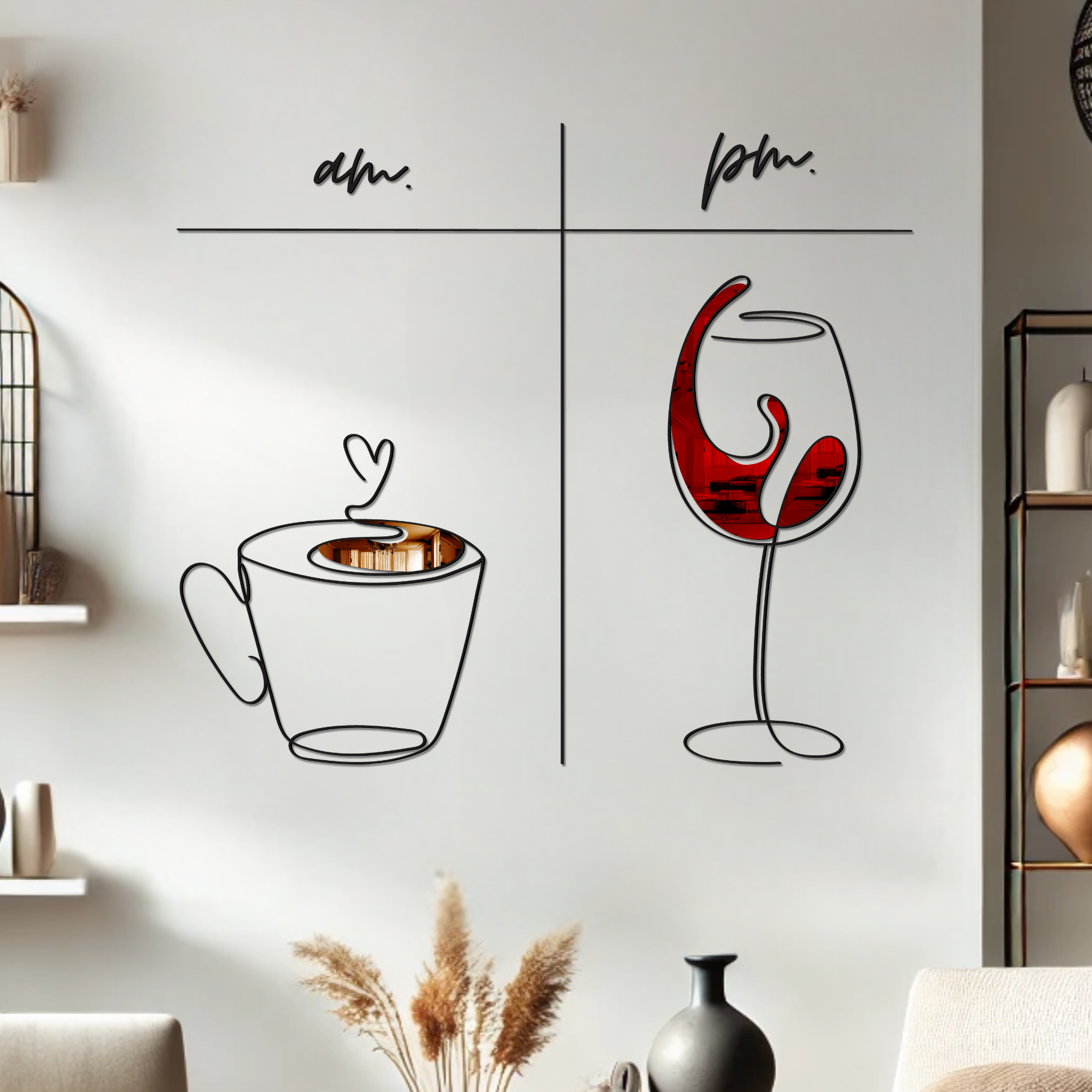 De manhã, um café quente para começar o dia com energia. À noite, um vinho refinado para relaxar e apreciar o momento. A obra "AM/PM" captura essa dualidade em um design minimalista e sofisticado, representando a harmonia entre produtividade e lazer. Feita em MDF de alta qualidade, esta peça traz um toque moderno e expressivo para sua decoração. Perfeita para quem valoriza cada instante do dia, do primeiro gole ao último brinde. Transforme sua parede com um toque de arte e estilo agora mesmo!