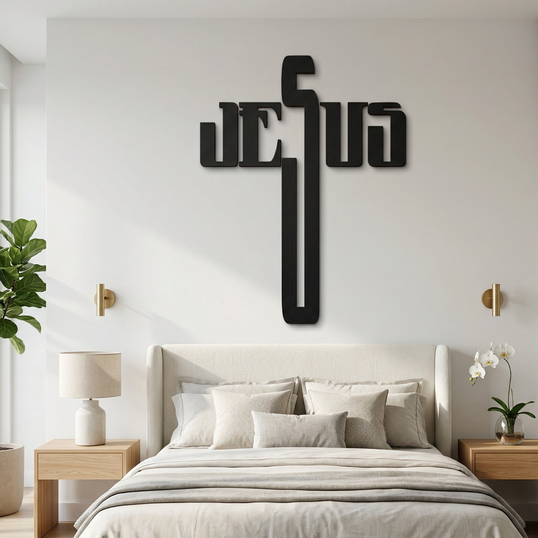 “Jesus – Palavra em Forma de Cruz” nasce do encontro entre fé e arte: a própria palavra Jesus se transforma na cruz que sustenta e ilumina a vida, trazendo para a parede um símbolo de proteção, esperança e presença divina, capaz de criar um ambiente de paz e espiritualidade todos os dias.