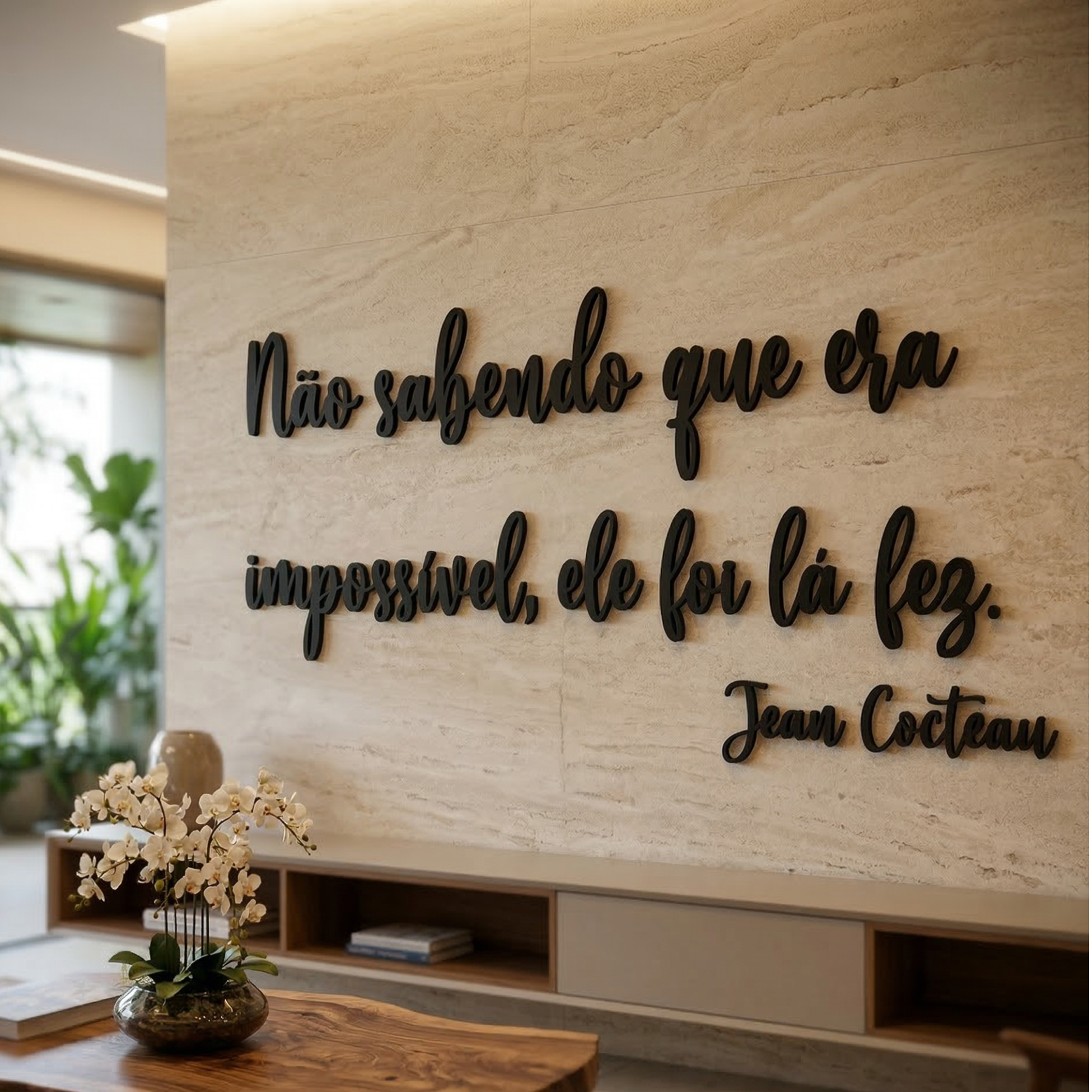 Na busca de criar um ambiente que reflita a coragem e determinação, a Decoranza apresenta o lettering decorativo "Não sabendo que era impossível, ele foi lá e fez." de Jean Cocteau. Imagine começar cada dia com uma dose de inspiração ao olhar para essa frase que celebra a superação dos limites. Com um design sofisticado e materiais de alta qualidade, este lettering é perfeito para transformar qualquer parede em um espaço de motivação. Aproveite a chance de renovar seu ambiente com uma mensagem que inspira ação e resiliência. Não perca a oportunidade de ter essa peça exclusiva em sua casa e sinta a diferença que ela pode fazer no seu dia a dia.