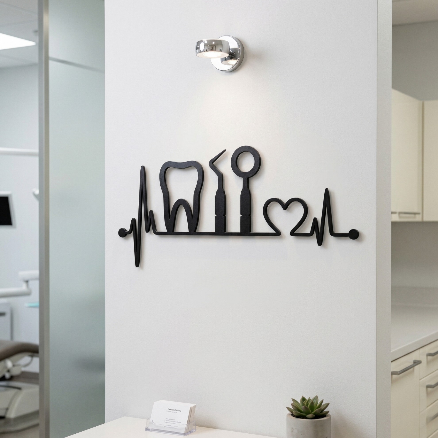 Imagine entrar em seu consultório e ser 3 diasmente acolhido por uma peça de arte que não só embeleza o ambiente, mas também conta a história da sua paixão pela odontologia. A escultura de parede da Decoranza, com seus batimentos cardíacos entrelaçados com símbolos odontológicos, como o dente, espelho e sonda, é mais do que uma simples decoração. Ela é uma expressão da sua dedicação à saúde bucal, um lembrete constante do impacto que você causa na vida de seus pacientes.