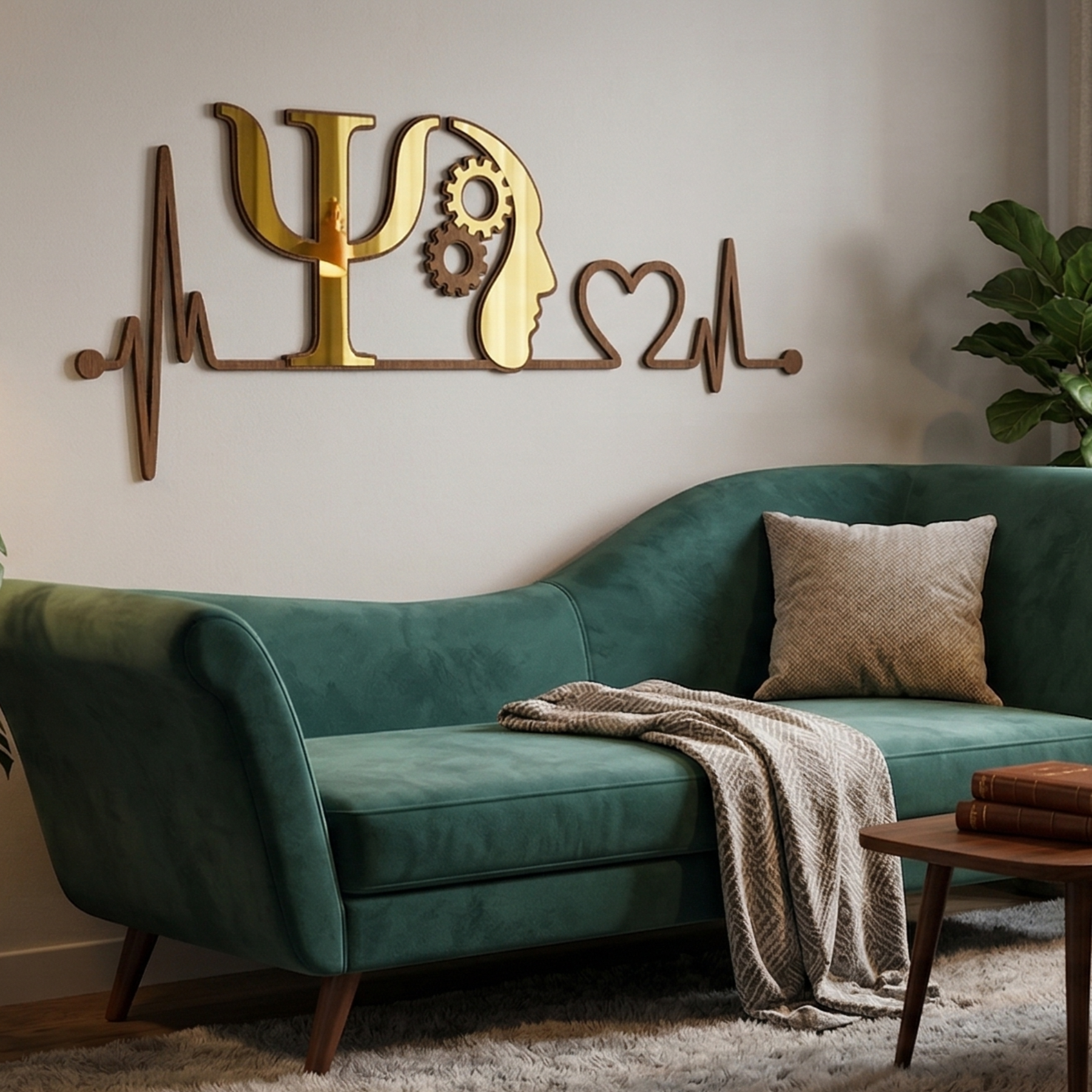 A inspiração para a criação desta escultura decorativa em MDF da Decoranza nasceu da profunda conexão entre a mente e o coração, elementos centrais na prática da psicologia. A escolha dos batimentos cardíacos como base do design representa a vitalidade e a pulsação da vida, enquanto o símbolo da psicologia, acompanhado do perfil humano e engrenagens, destaca o equilíbrio delicado entre a razão e a emoção.