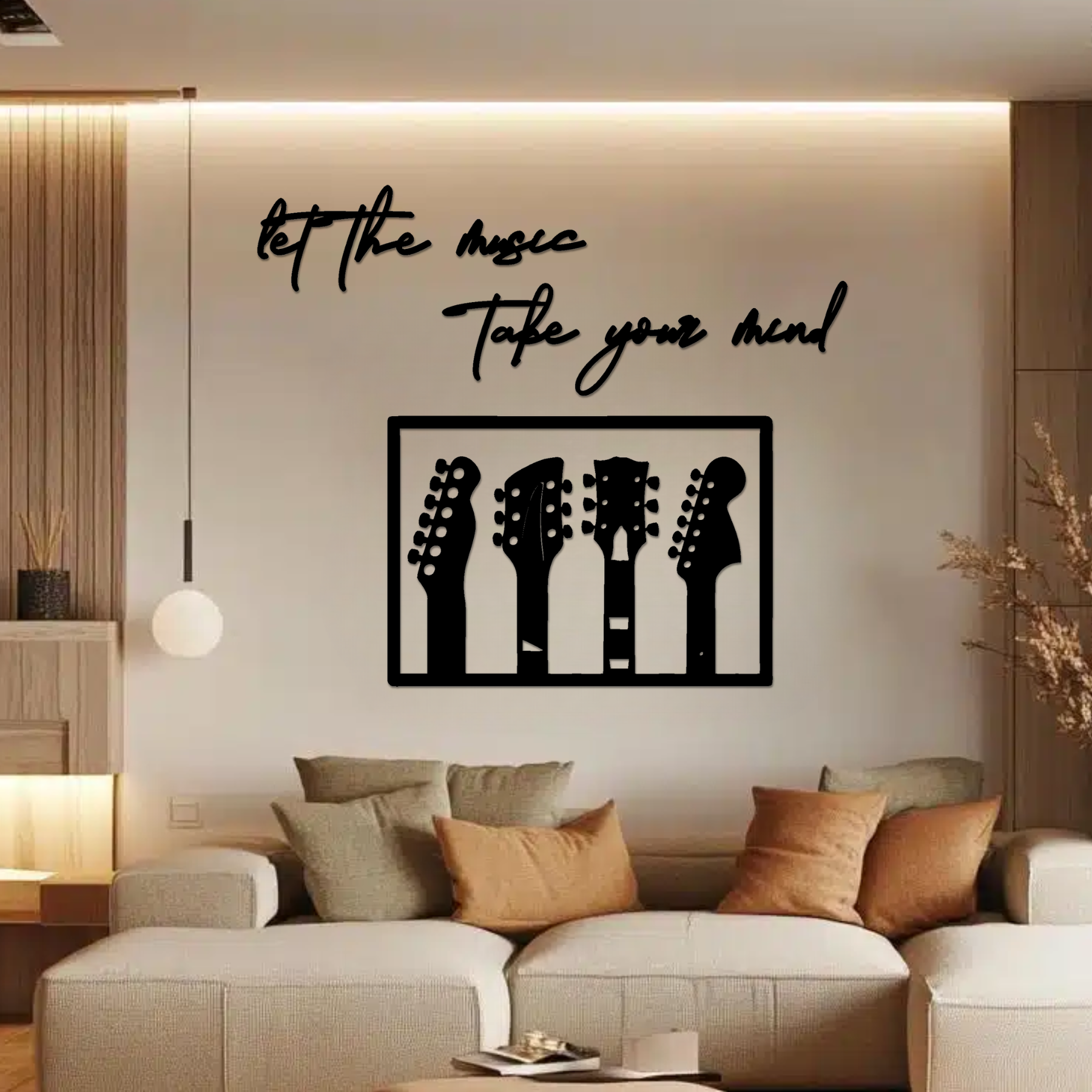 A obra “Let the Music Take Your Mind” é um tributo à paixão pela música e ao poder que ela tem de nos transportar para outros mundos. Com guitarras em destaque e o lettering que evoca liberdade e criatividade, a peça combina arte e sentimento em um design moderno e expressivo. Ideal para amantes da música, músicos e ambientes que buscam inspiração, este painel em MDF é um convite para deixar o som guiar a alma e transformar o espaço com energia e personalidade.
